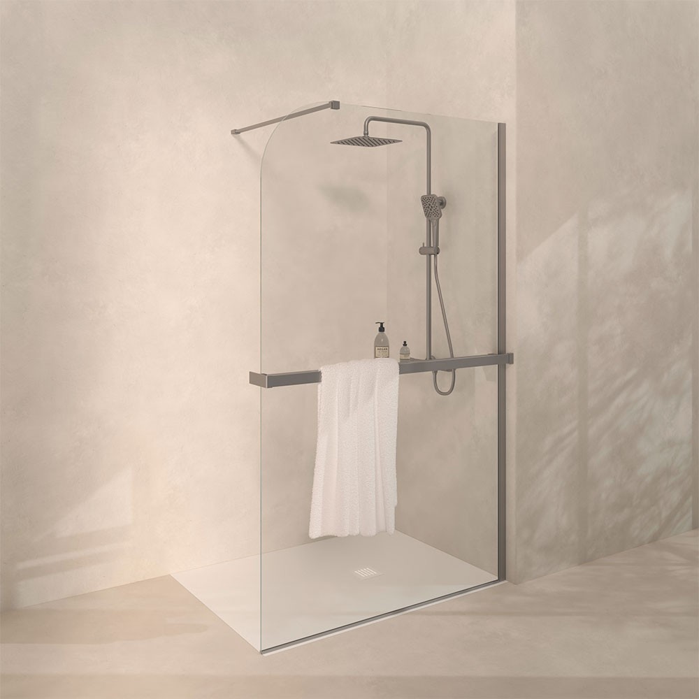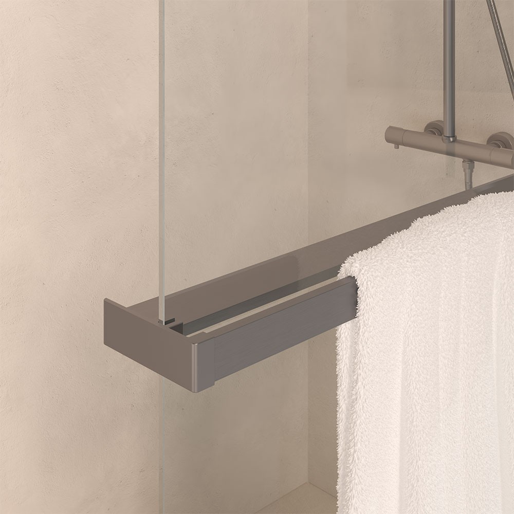 1 porte serviettes avec étagère recoupable 140 cmPour paroi de douche à l’italienneFixation au mur et pince pour paroi de 8 mm